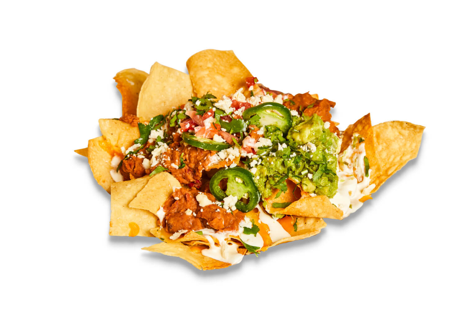 Tortilla chips topped with beans, pico de gallo, guacamole, cheese, queso fresco, sour cream, jalapenos, and cilantro. Add your favorite protein or veggie option.